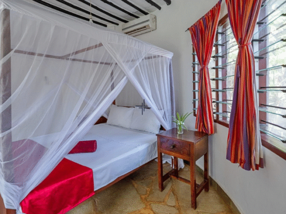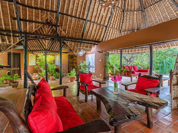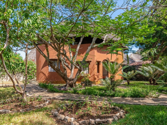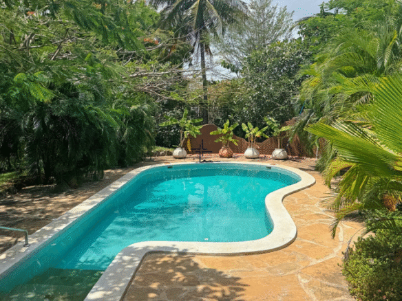 This is a 3-bedroom house with a 3-bedroom guest house for sale in Diani. The property sits on a freehold 1-acre plot, beautifully landscaped into an oasis of palms and fruit trees. It features a swimming pool and a spacious gazebo, creating the perfect setting for relaxed coastal living. The residence is located approximately 880 metres from the beach, 300 metres from a tarmac/cabro road, 1.5 kilometres from a small supermarket, and 3 kilometres from a larger shopping centre.