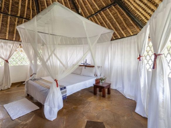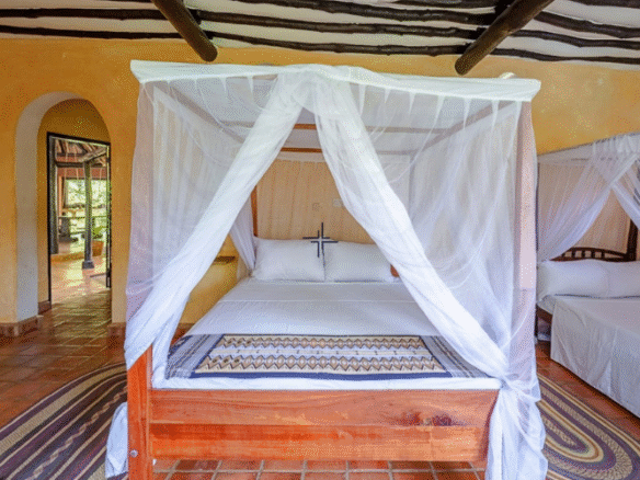 - All exposed sisal poles in the makuti roof are wrapped in aluminium foil to deter carpenter bees.