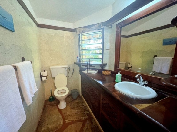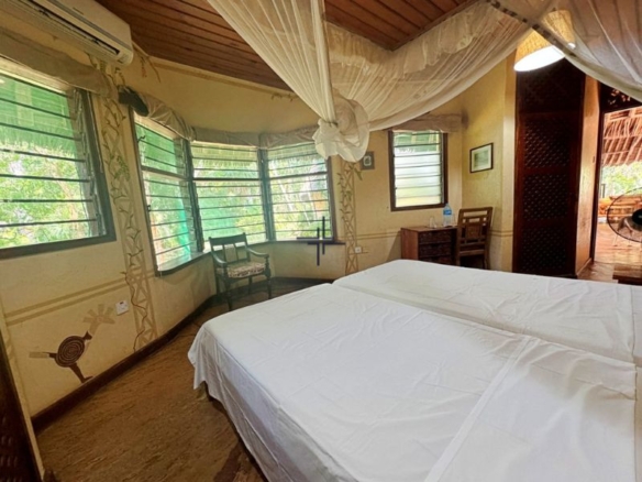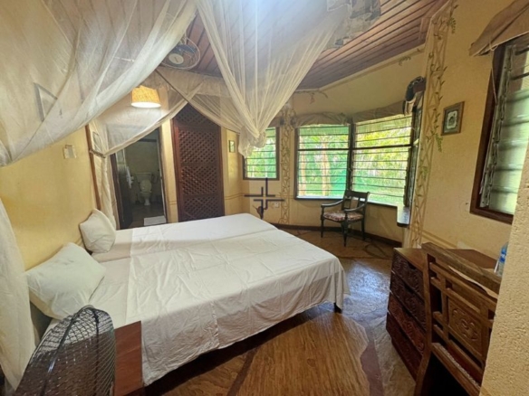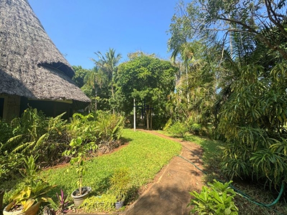 This is a charming 5-bedroom house for sale in Diani. It is set on a 0.63-acre freehold plot within a secure 5-acre estate. Positioned on the third row, approximately 1 km from the beach, the property offers privacy and proximity to the ocean. The luscious garden is adorned with palm trees, indigenous flora, and well-manicured grass.