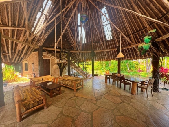The ground floor of this double-storey house boasts an expansive verandah-style living space, with open-plan sitting and dining areas that provide a seamless indoor-outdoor experience. There is a spacious kitchen with a dhobi area at the back and three ensuite bedrooms, one of which features a private lounge area. Upstairs are two additional ensuite bedrooms. The home has a makuti/thatch roof with transparent sections that allow natural light to filter in, enhancing the warm, airy atmosphere of the home.