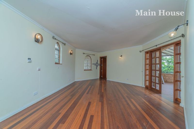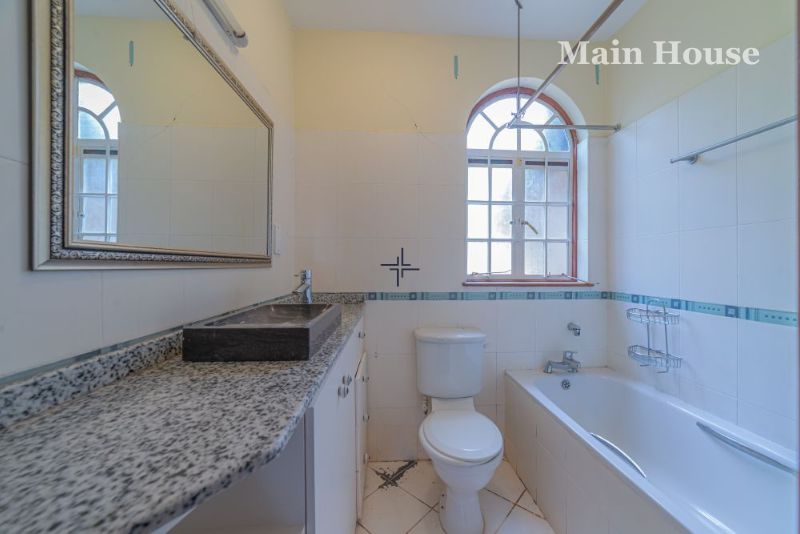 The double-storey main house welcomes you through a spacious entrance foyer accessed from a private courtyard. The high-ceiling living room with its arched windows and doors opens out onto the lush gardens, creating a seamless indoor-outdoor flow. To the left of the entry lies an island-style fitted kitchen with white granite countertops. A family room and two ensuite bedrooms completes the ground floor. Upstairs, the ensuite master bedroom has a walk-in closet and a balcony overlooking the garden. This floor also includes a children’s bedroom and a study room.