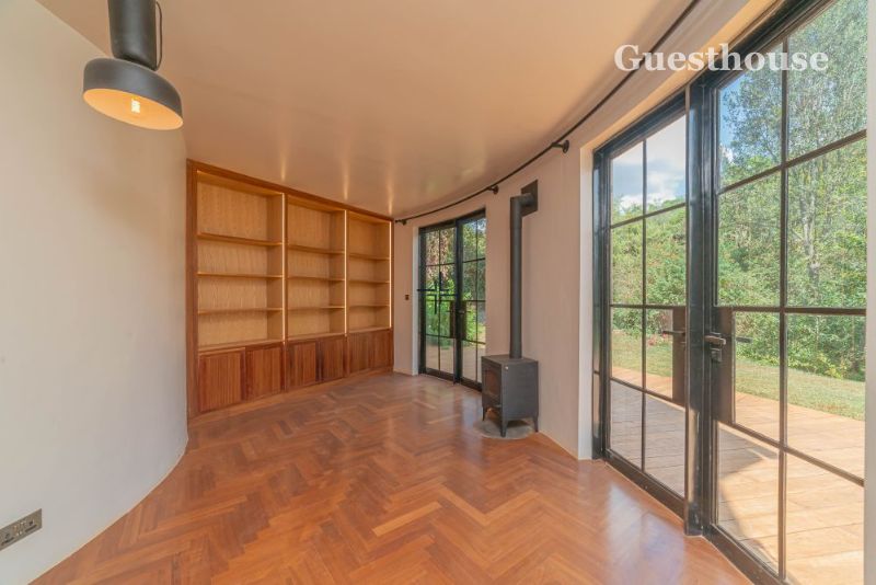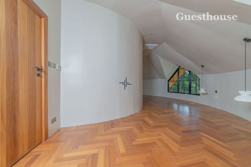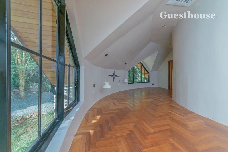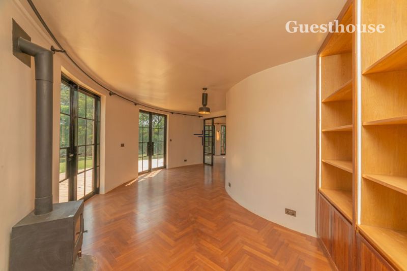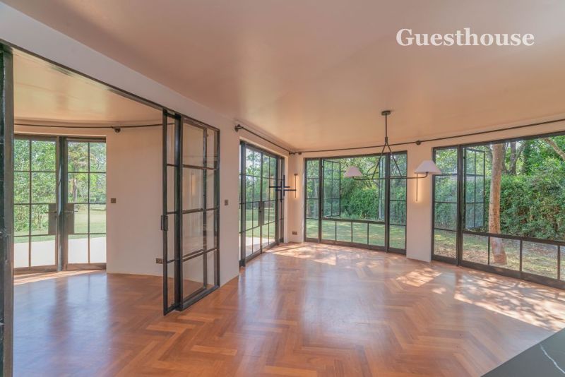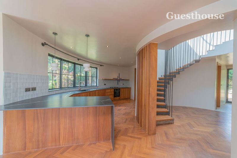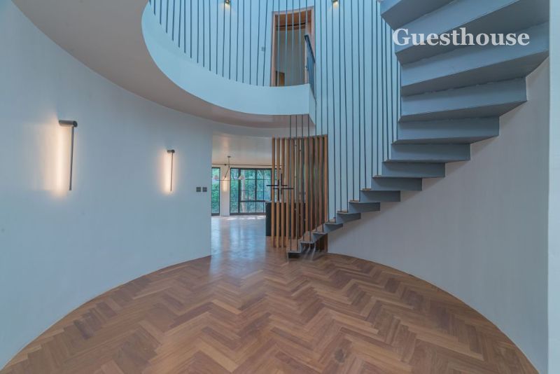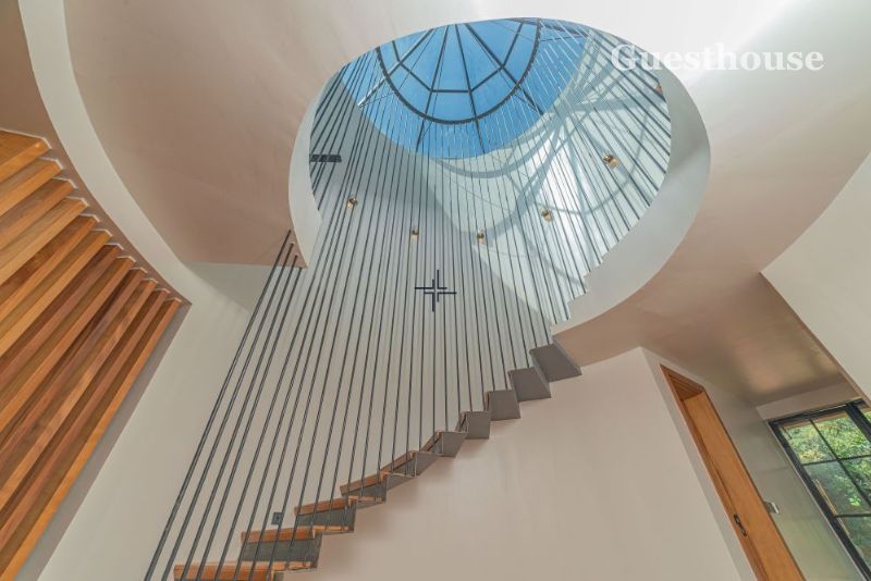 The newly-built guest house is an architectural gem, designed around a naturally lit atrium crowned with a decagon glass roof. A circular staircase with birdcage-style bannisters adds a touch of artistry. The open-plan kitchen, finished with black marble countertops and elegant bronze faucets, opens into a welcoming dining space. Both bedrooms are ensuite with built-in cabinetry.