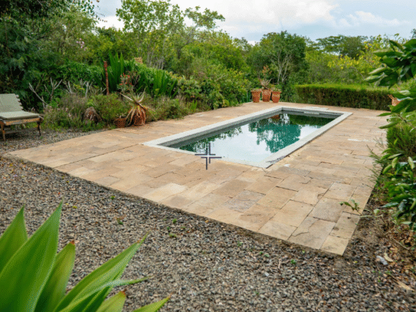 A solar-heated lap pool and pool house sit close to the main verandah.