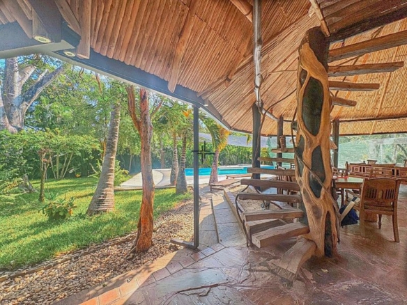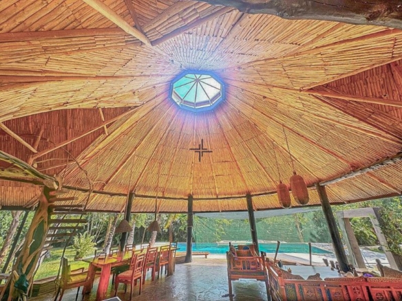 The living space comprises a round, expansive pavilion that offers an indoor/outdoor lifestyle with plenty of room for sitting, dining, and entertaining. The pavilion overlooks the swimming pool and features a uniquely crafted roof with a circular skylight at its peak. Off to the side, a shaded path leads to an enclosed sitting room for those cooler or rainy days.