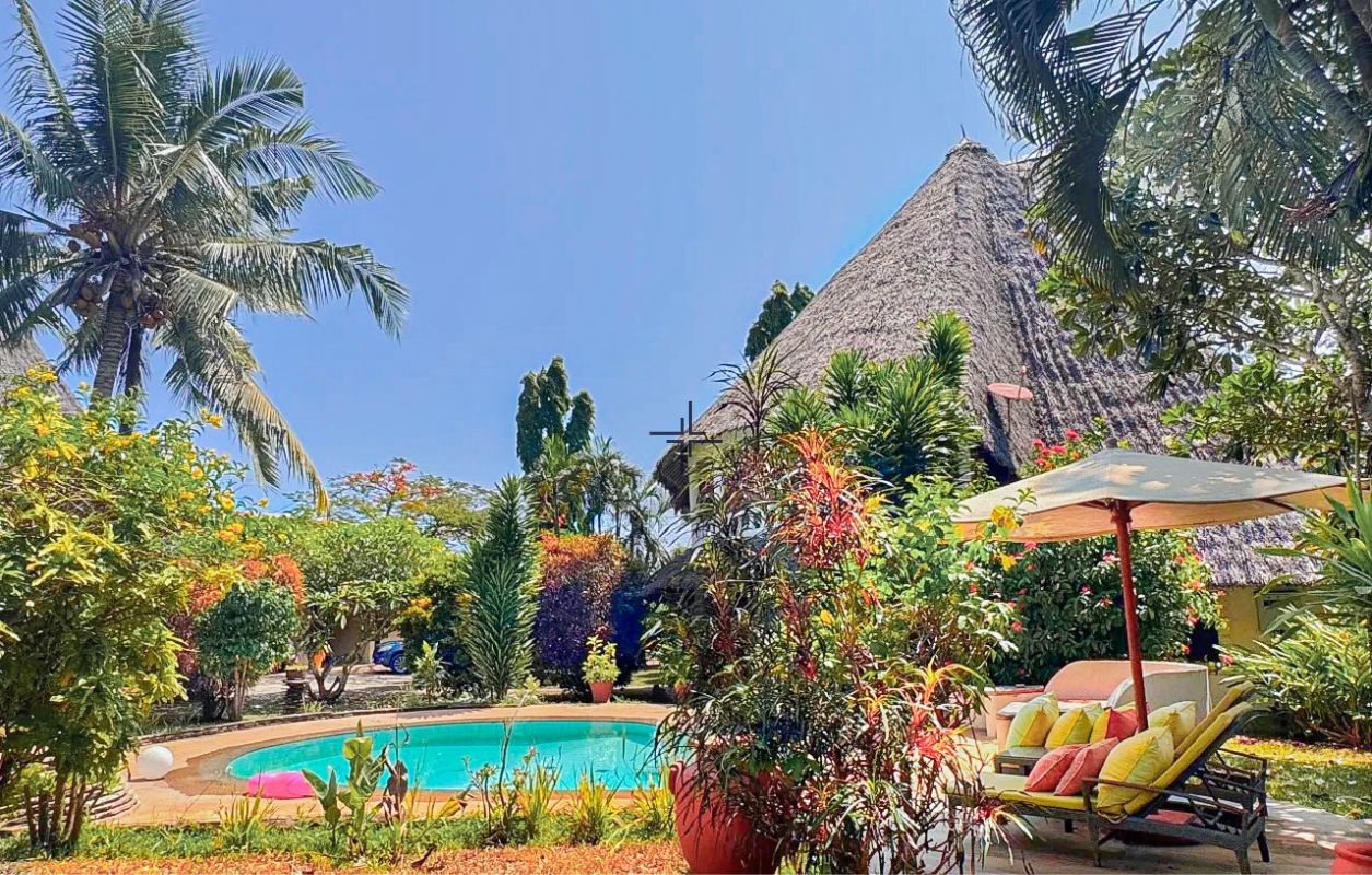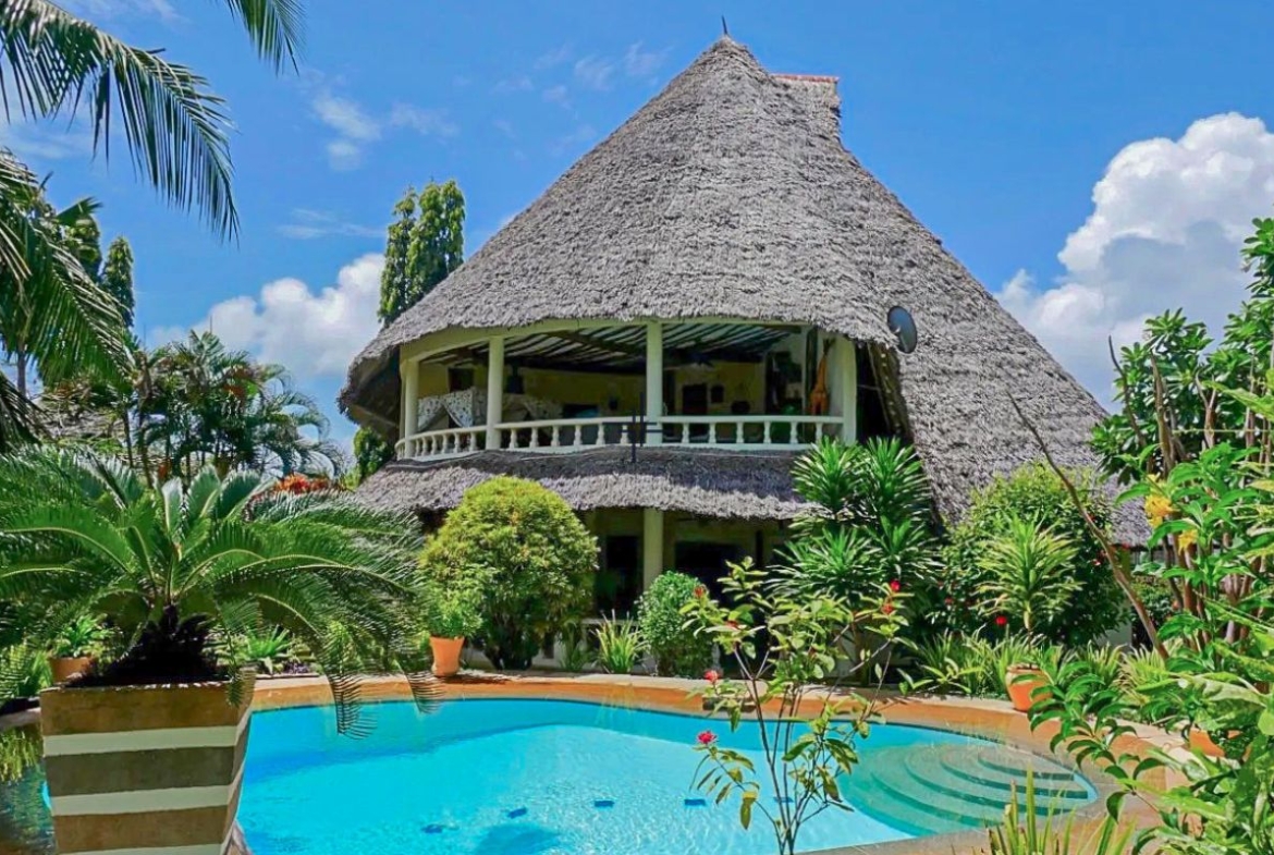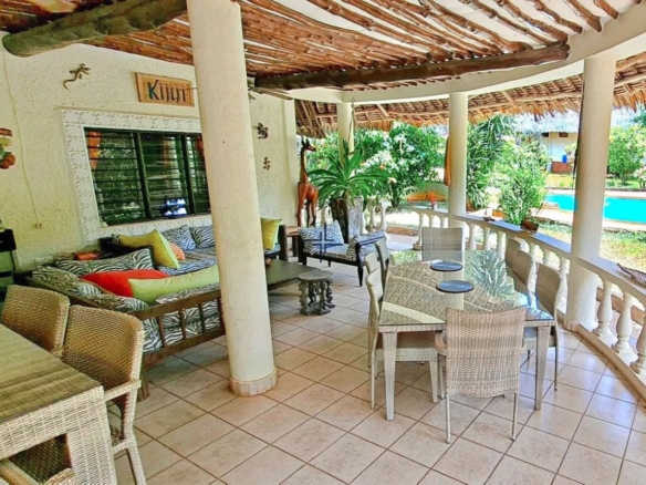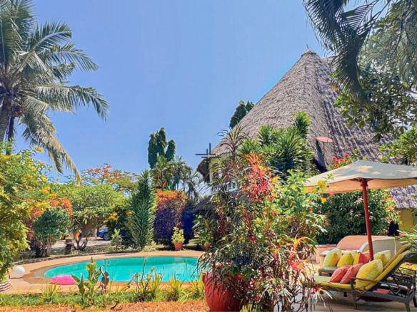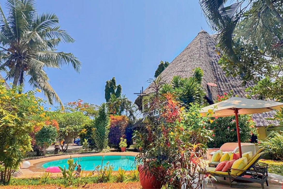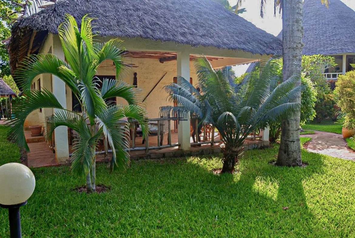 This is an inviting 2-bedroom house with a cottage for sale in Diani. The leasehold 3rd-row property sits on a 0.5-acre lush, tropical garden just off the tarmac road and only 740 metres from the beach.