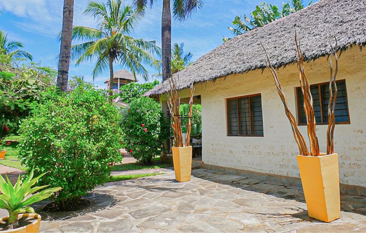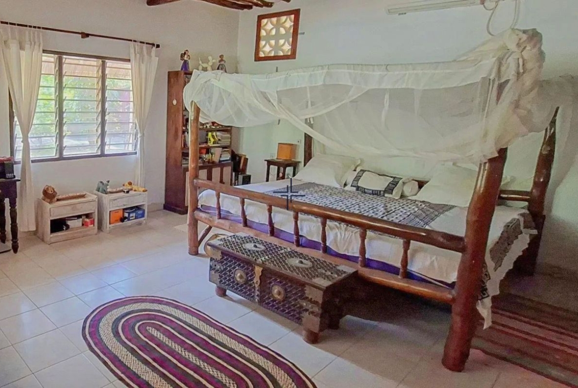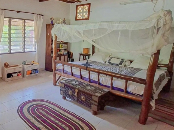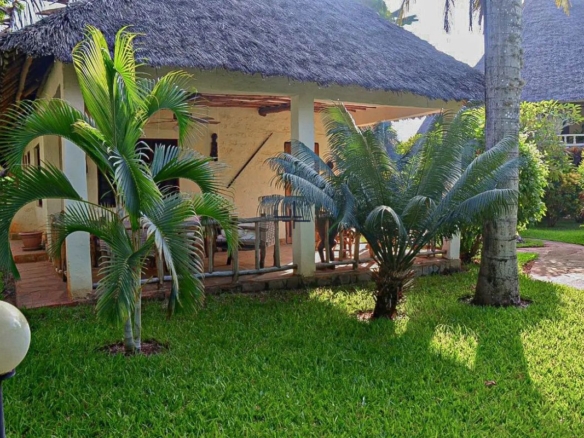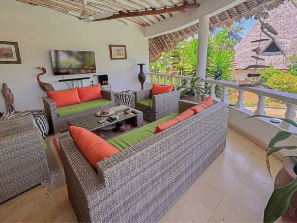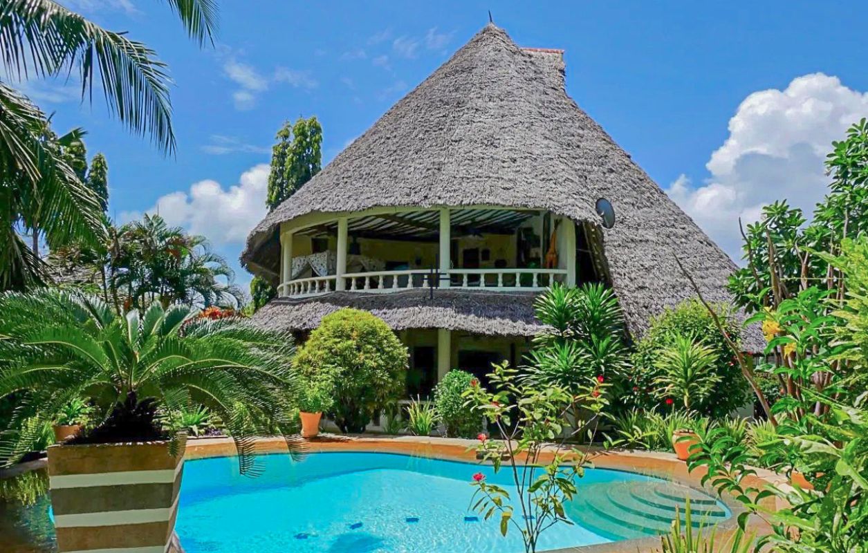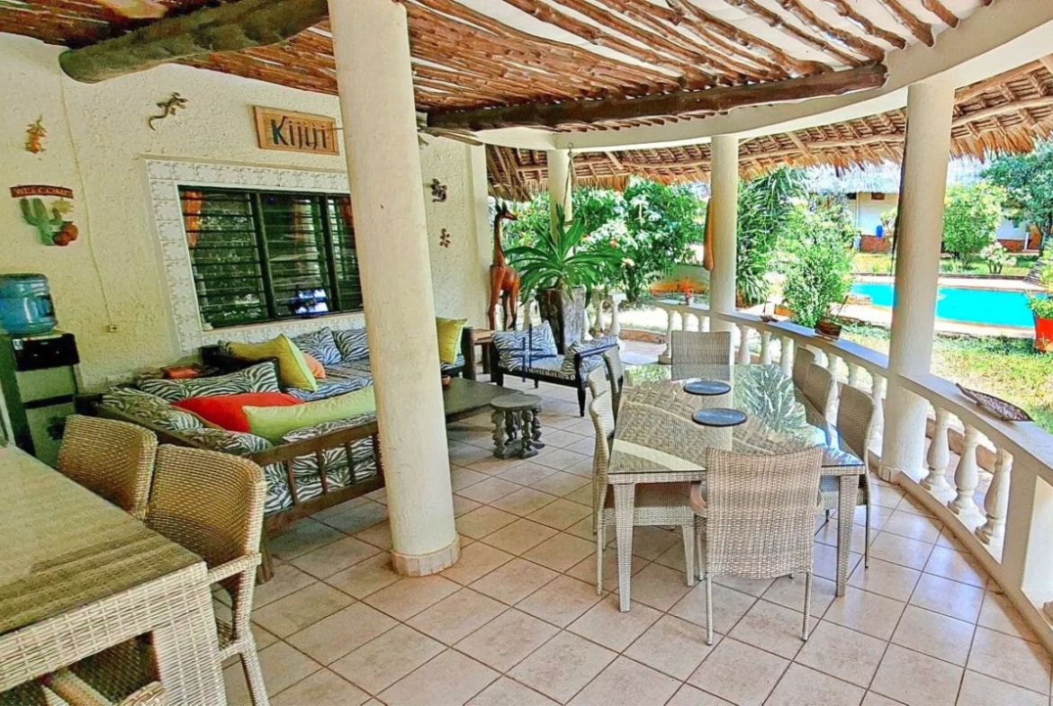 This is an inviting 2-bedroom house with a cottage for sale in Diani. The leasehold 3rd-row property sits on a 0.5-acre lush, tropical garden just off the tarmac road and only 740 metres from the beach.