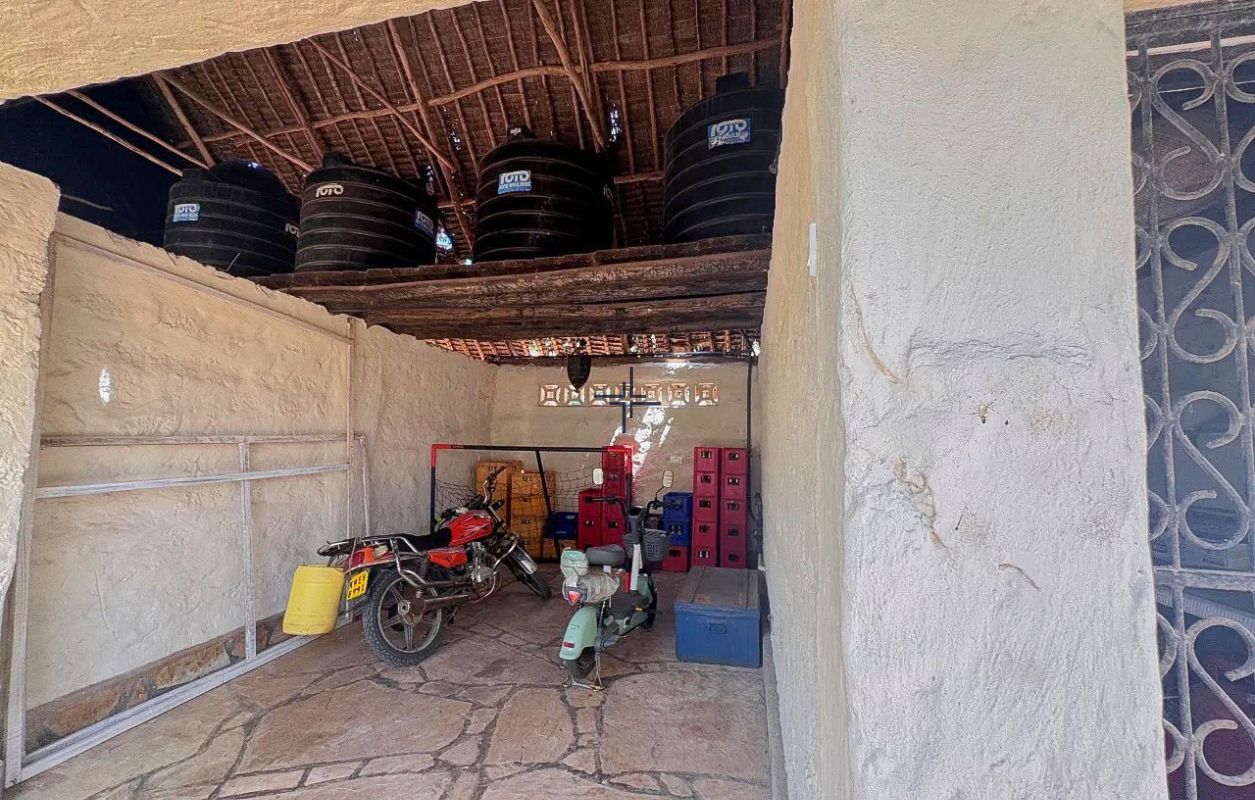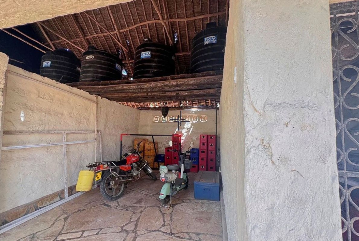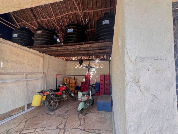 Additional amenities include two stores, a garage for one vehicle, staff area with bathroom, KPLC power connection, slightly brackish well water, an overhead water tank plus several smaller tanks above the stores and garage, multiple water points throughout the garden and a hot water boiler.