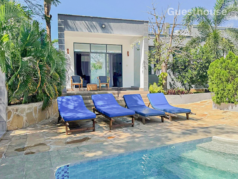 The guesthouse features an open-plan kitchen/sitting/dining room leading out onto a verandah overlooking the swimming pool. It also has one bedroom with air conditioning and a ceiling fan as well as a separate bathroom.