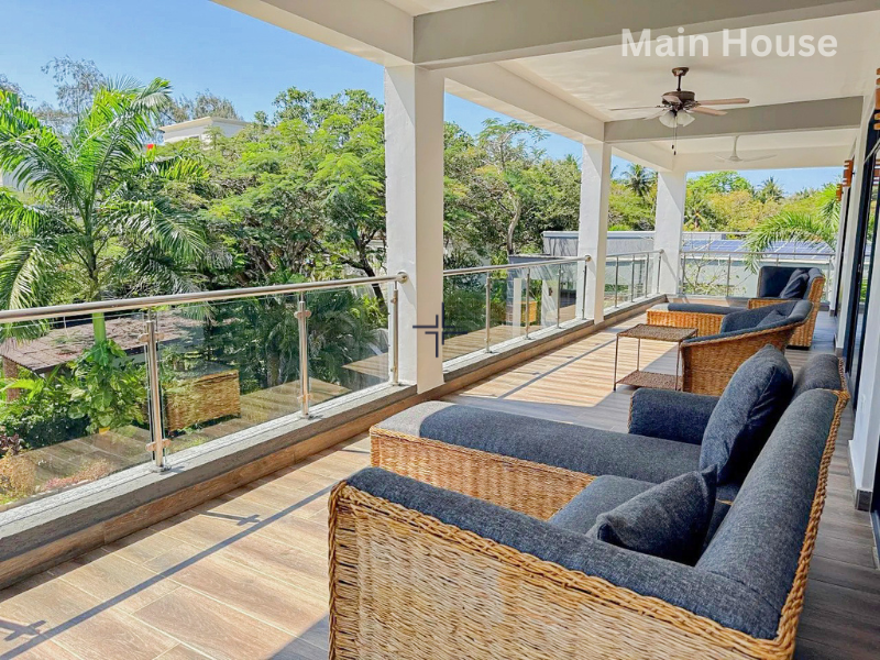 The double-storey main house features a ground floor with an open-plan kitchen/sitting/dining room that opens onto a verandah. The verandah spans the length of the house and overlooks the swimming pool. The ground floor also includes an ensuite guest bedroom and a separate guest toilet. The first floor has a landing currently functioning as a lounge with a kitchenette and opens up onto a terrace that also spans the length of the house. The first floor also has two ensuite bedrooms, each with a walk-in closet and air conditioning. The home also includes a laundry room, a room that can be used as a store or staff accommodation, a staff bathroom, and a large store. All indoor areas are fitted with ceiling fans.