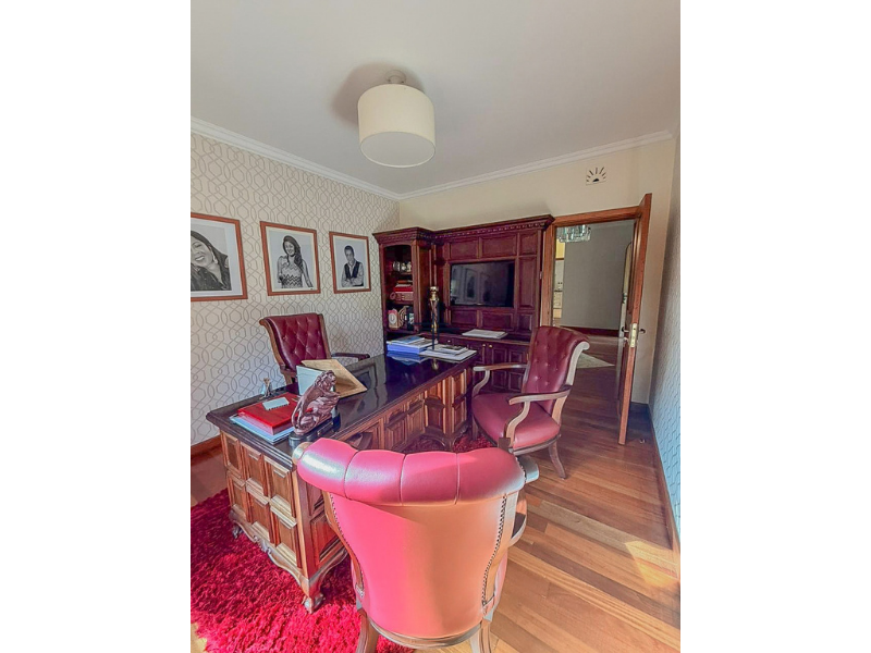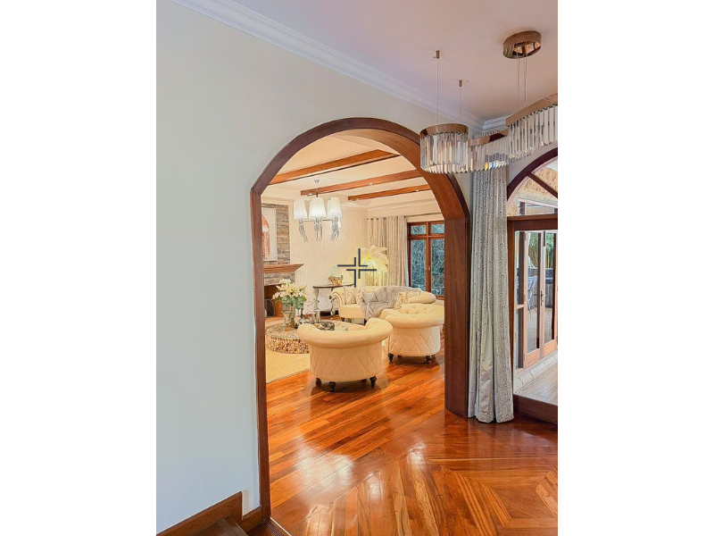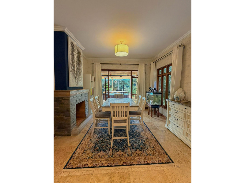 The house comes with high-end fixtures and finishes, and hardwood floors with tiles in selected areas. The double-storey home opens onto a grand entrance hallway with a cloakroom. This level also includes a lovely sitting room with a fireplace, a formal dining room with a fireplace, a fully fitted kitchen with a central island and pantry, a study room and an ensuite guest bedroom. The staircase leads to a first-floor landing area. This floor also hosts a family lounge with a fireplace that opens onto a balcony and four ensuite bedrooms, including a spacious master bedroom with a walk-in closet and private balcony. The large live-in verandah provides an excellent entertainment space. It boasts a built-in bar, an outdoor kitchen with marble countertops, and a barbecue area, all overlooking the manicured garden.