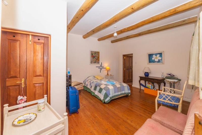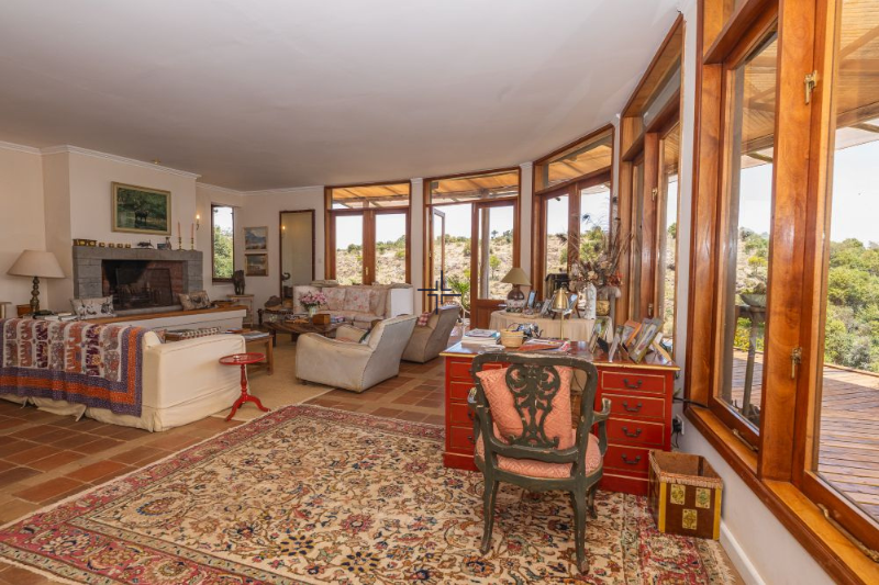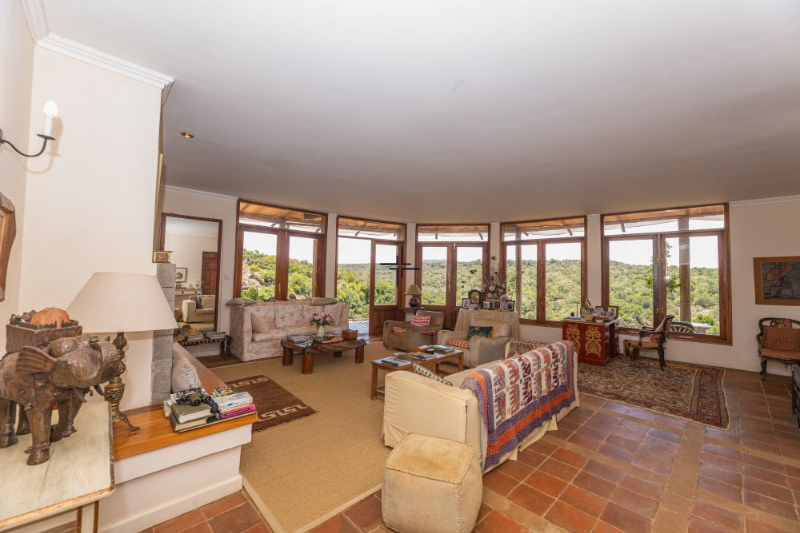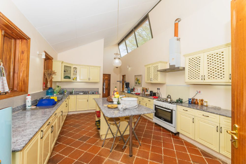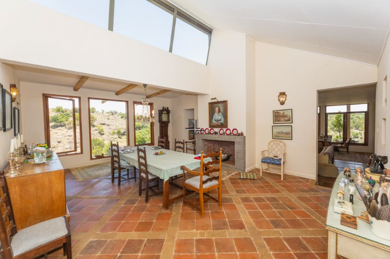 The main house opens into a spacious 75 sqm sitting room with a fireplace and a large window wall that floods the space with natural light while framing sweeping views of the surrounding landscape. The sitting room extends to a wrap-around verandah, ideal for outdoor relaxation and entertaining. Additional spaces include a generous dining room, a modern kitchen with ample storage, a 20 sqm library/TV room, an 18 sqm study, a bar, cloakroom and dhobi area. The 56 sqm master bedroom features a private lounge with a fireplace, a window wall and a luxurious ensuite bathroom with a bathtub offering sweeping views across Sangare. Two further ensuite bedrooms complete the main house, one of which also has a fireplace.